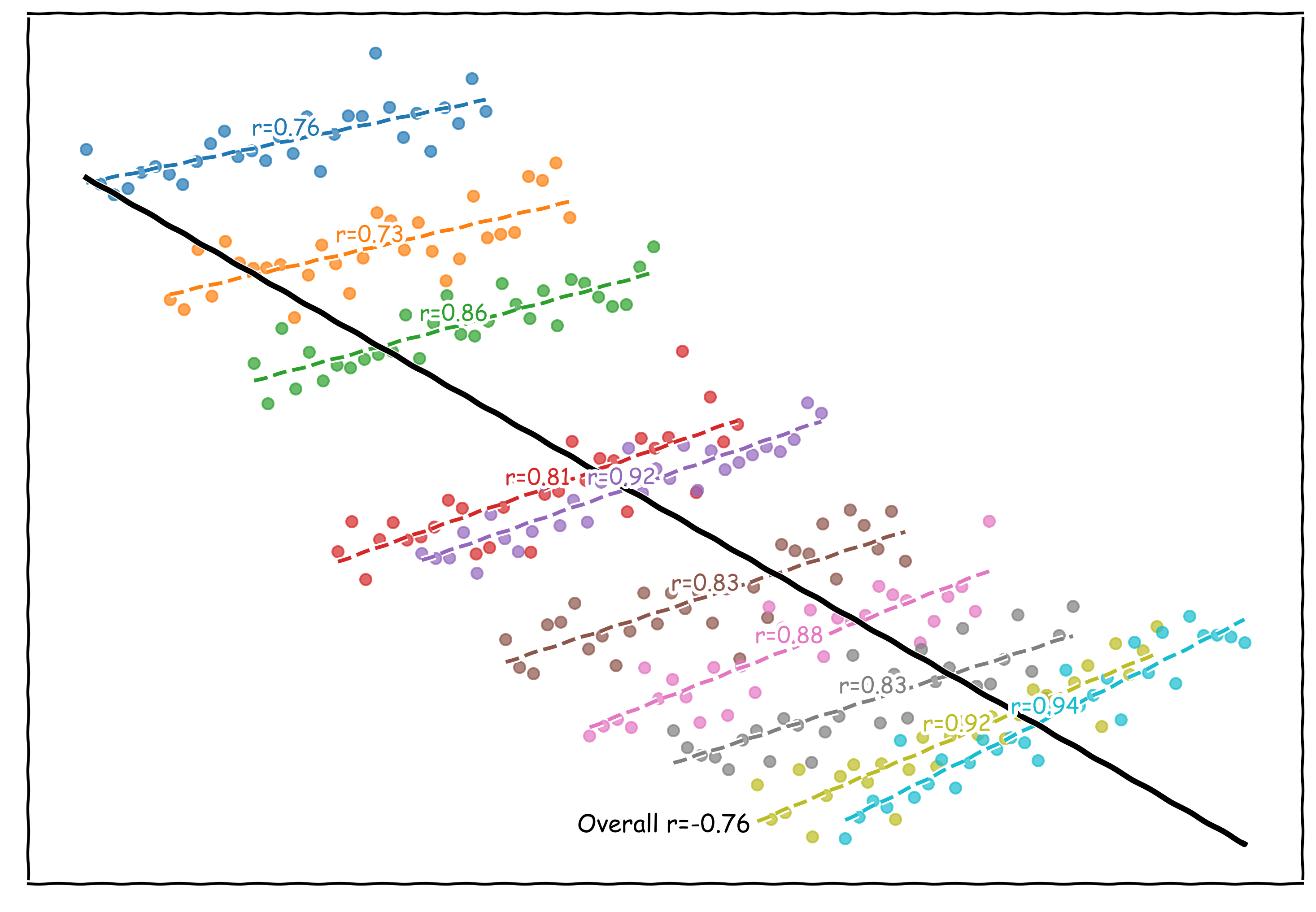 The next thing we need to define is what Simpson’s Paradox is. A (in my opinion) reasonable way to characterize this paradox is that trends that might appear at the dataset level can reverse when you break the dataset into subgroups.